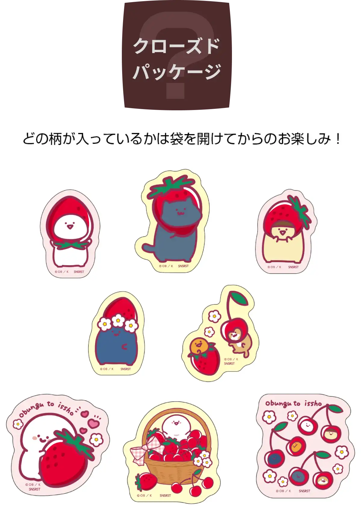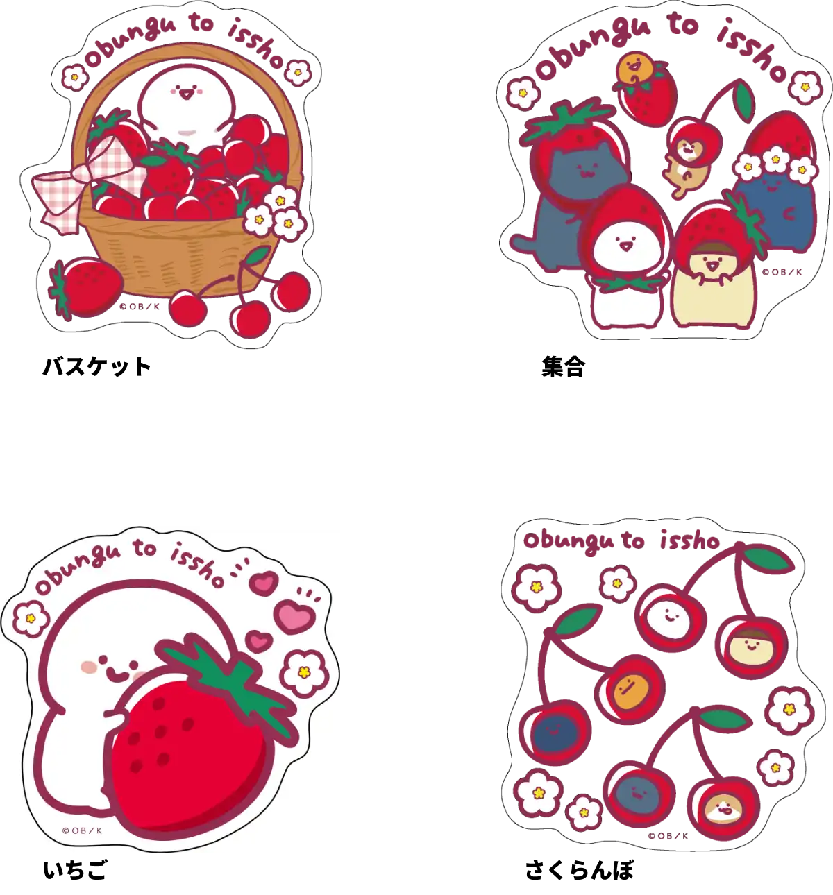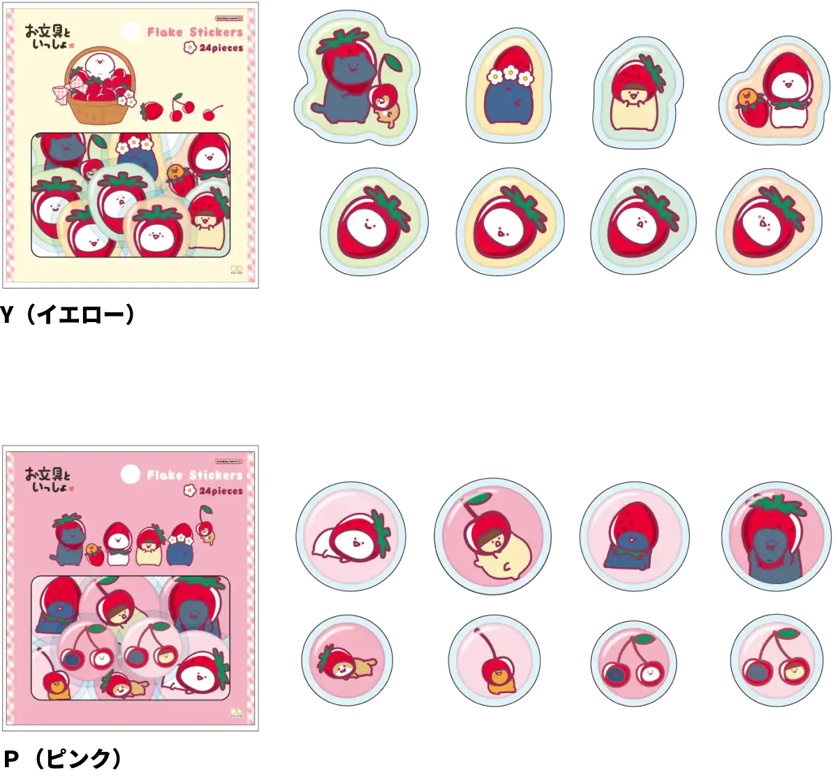 【本体サイズ】約W90×H90mm以内 【本体重量】約2g 【材質】PET 【パッケージ】台紙付ヘッダー袋【パッケージ入サイズ】W90×H138×D1mm 【パッケージ入重量】約3g 【生産国】中国【JANコード】バスケット:4901770044200 集合:4901770044217 いちご:4901770044224 さくらんぼ:4901770044231