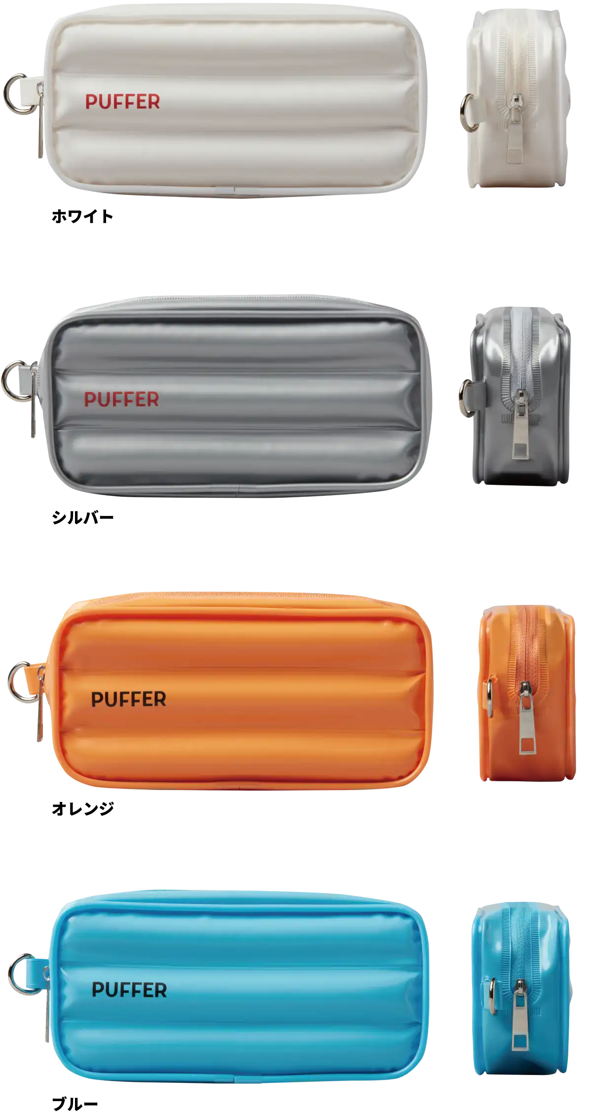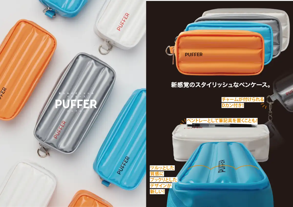 ペンケース PUFFER(パッファー) ¥1,320-(消費税込) 【本体サイズ】約W180×H85×D47mm 【本体重量】約64g 【材質】生地:PVC / 充填材:PE 【パッケージ】なし(JAN紙タグ付き) 【生産国】中国【JANコード】ホワイト:4901770049618 シルバー:4901770049625 オレンジ:4901770049632 ブルー:4901770049649