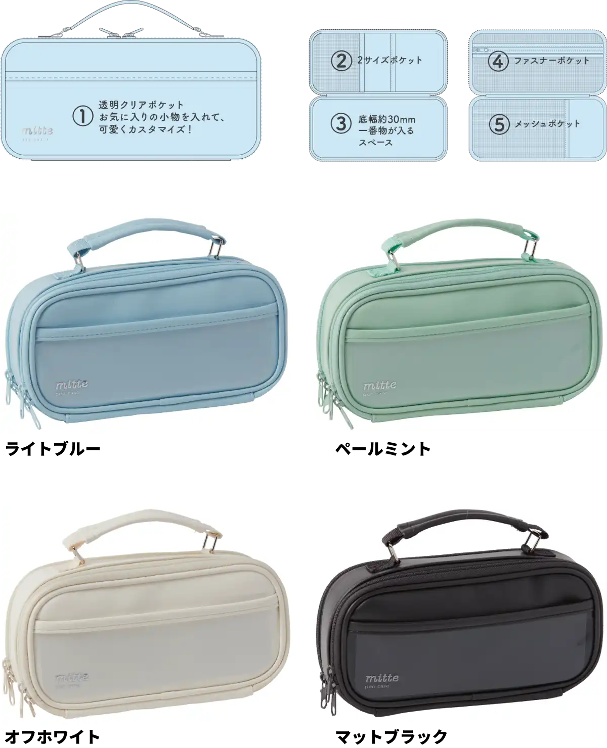 【本体サイズ】約W205×H120×D50mm(持ち手含む) 【本体重量】約126g【材質】PVC・PU・ポリエステル 【パッケージ】なし(タグ・ループ付) 【生産国】中国【JANコード】ライトブルー:4901770046655 ペールミント:4901770046662 オフホワイト:4901770046679 マットブラック:4901770046686