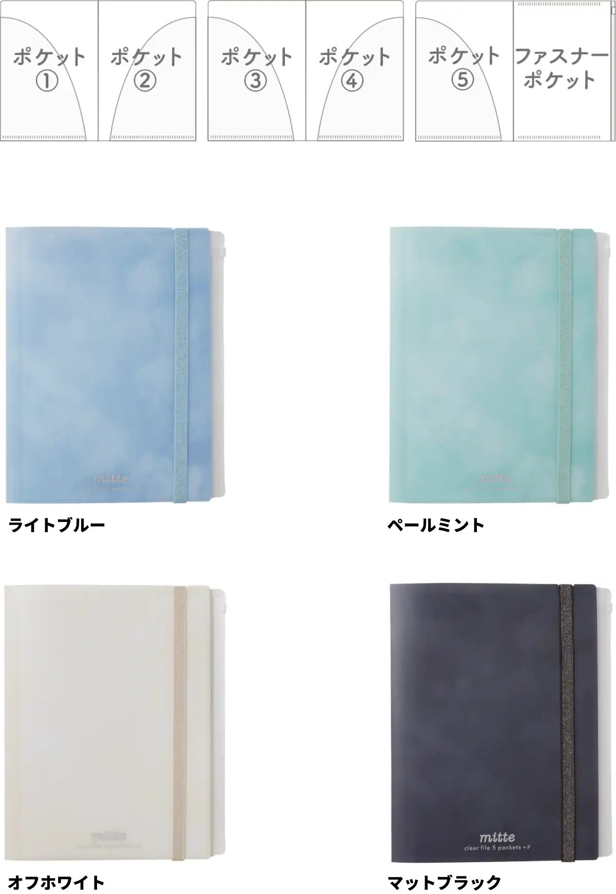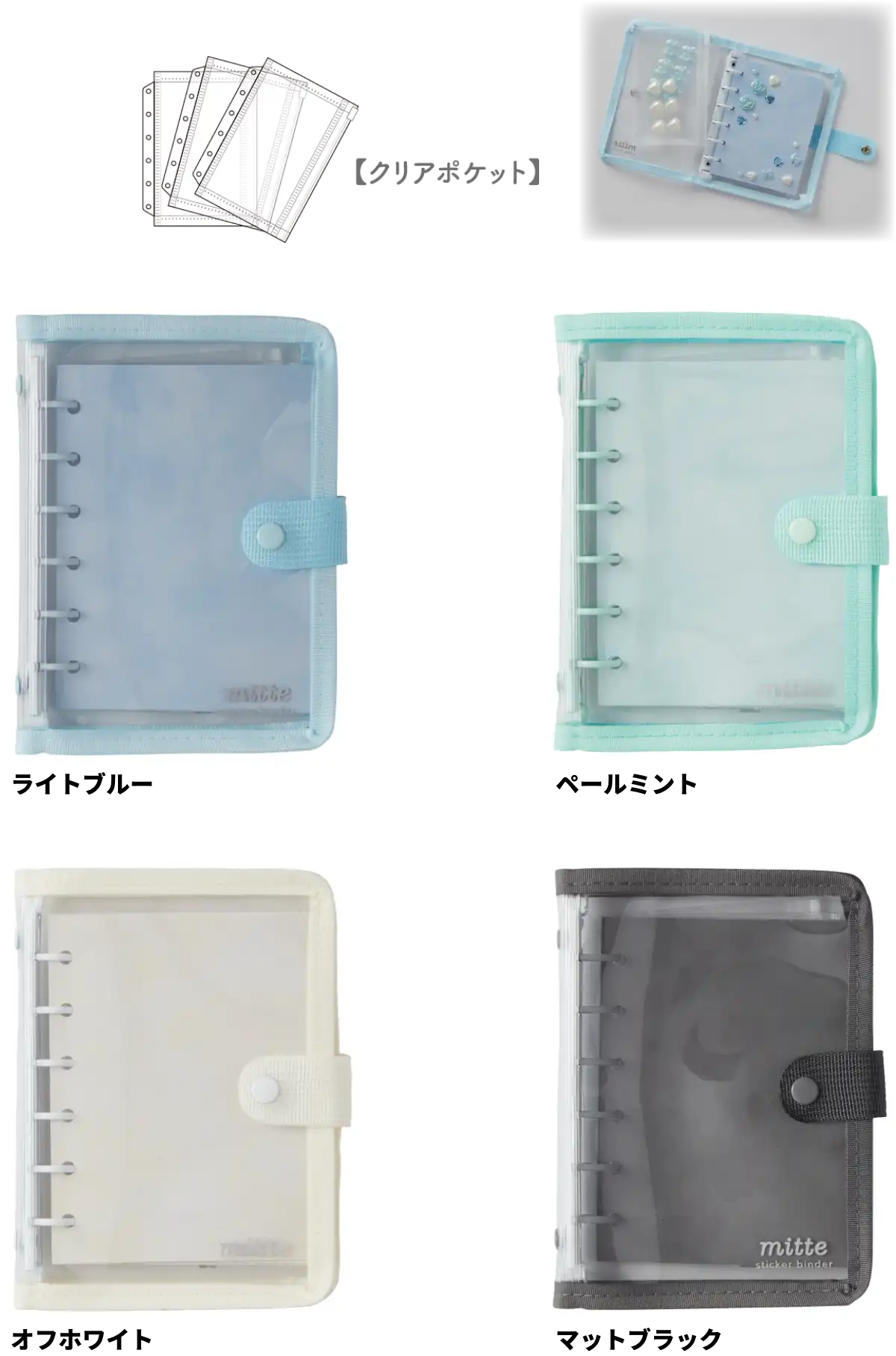 【本体サイズ】W115×H160×D25mm 【本体重量】103g【材質】PVC・PP・ポリエステル・鉄【内容】シール台紙 : 10枚 / クリアポケット : 3枚【パッケージ】ヘッダー付きPP袋 【生産国】中国【JANコード】ライトブルー:4901770046815 ペールミント:4901770046822 オフホワイト:4901770046839 マットブラック:4901770046846