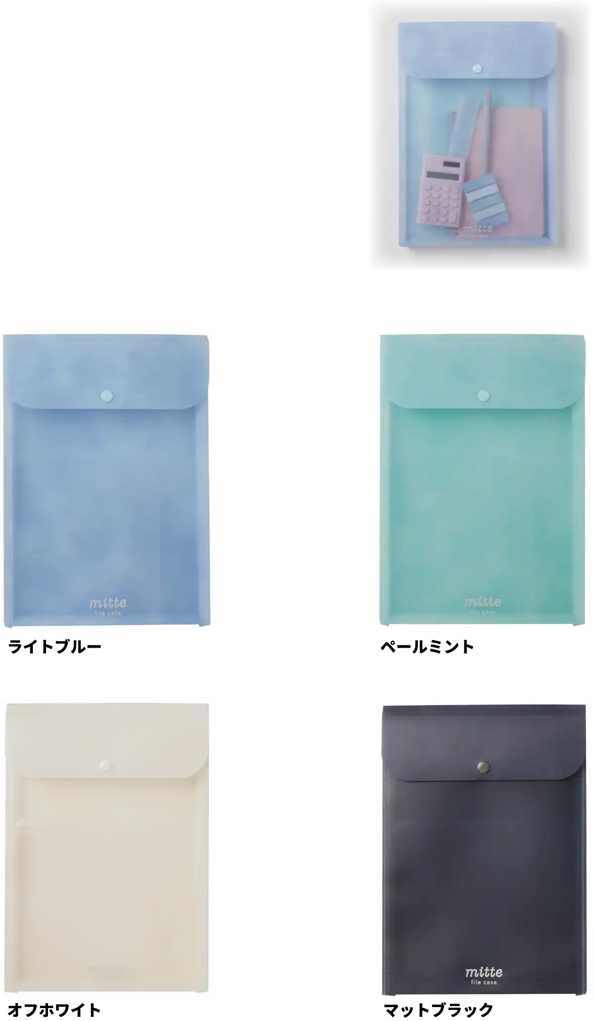 【本体サイズ】W195×H270×D30mm 【本体重量】63g 【材質】PP【パッケージ】PP袋 【生産国】中国【JANコード】ライトブルー:4901770046778 ペールミント:4901770046785 オフホワイト:4901770046792 マットブラック:4901770046808