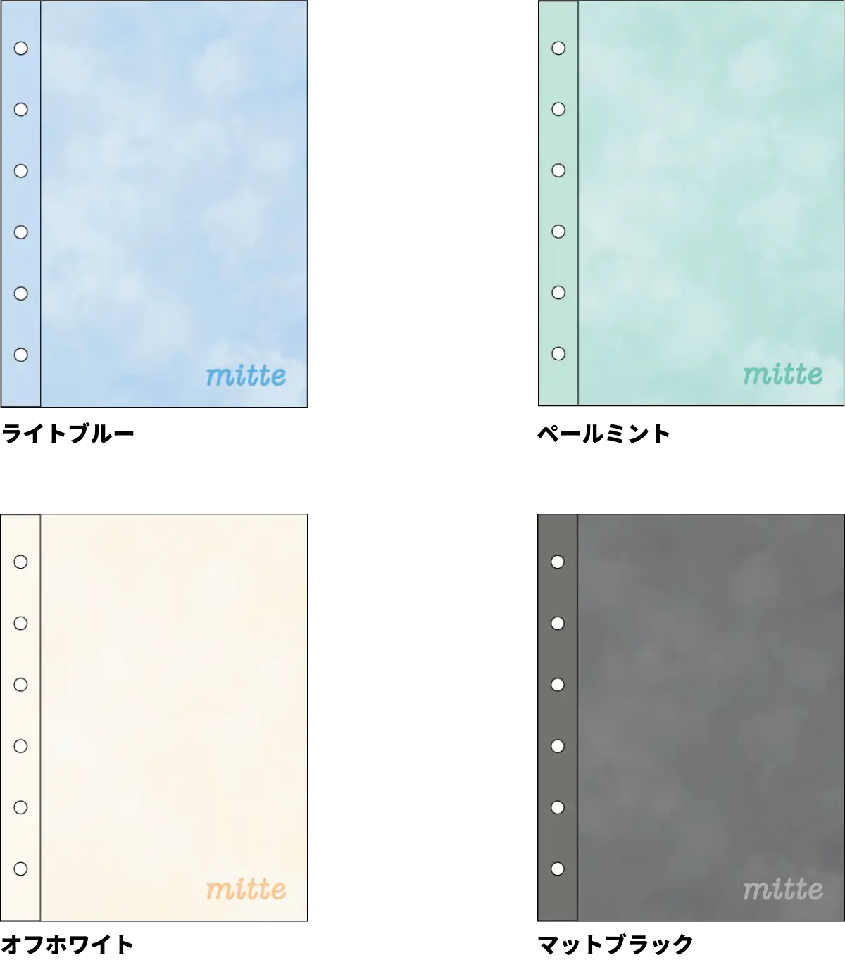 【本体サイズ】W95×H126×D3mm 【本体重量】33g【内容】12枚(24ページ)【材質】PP 【パッケージ】ヘッダー付きPP袋 【生産国】中国【JANコード】ライトブルー:4901770046853 ペールミント:4901770046860 オフホワイト:4901770046877 マットブラック:4901770046884