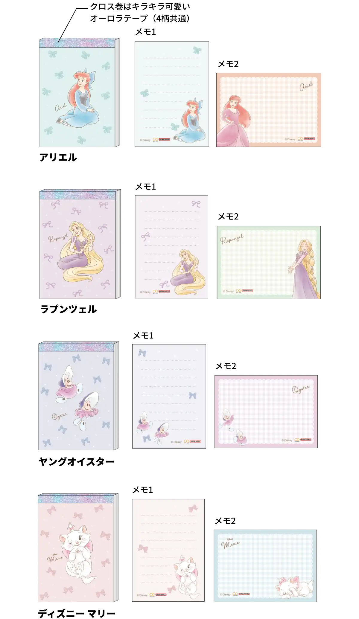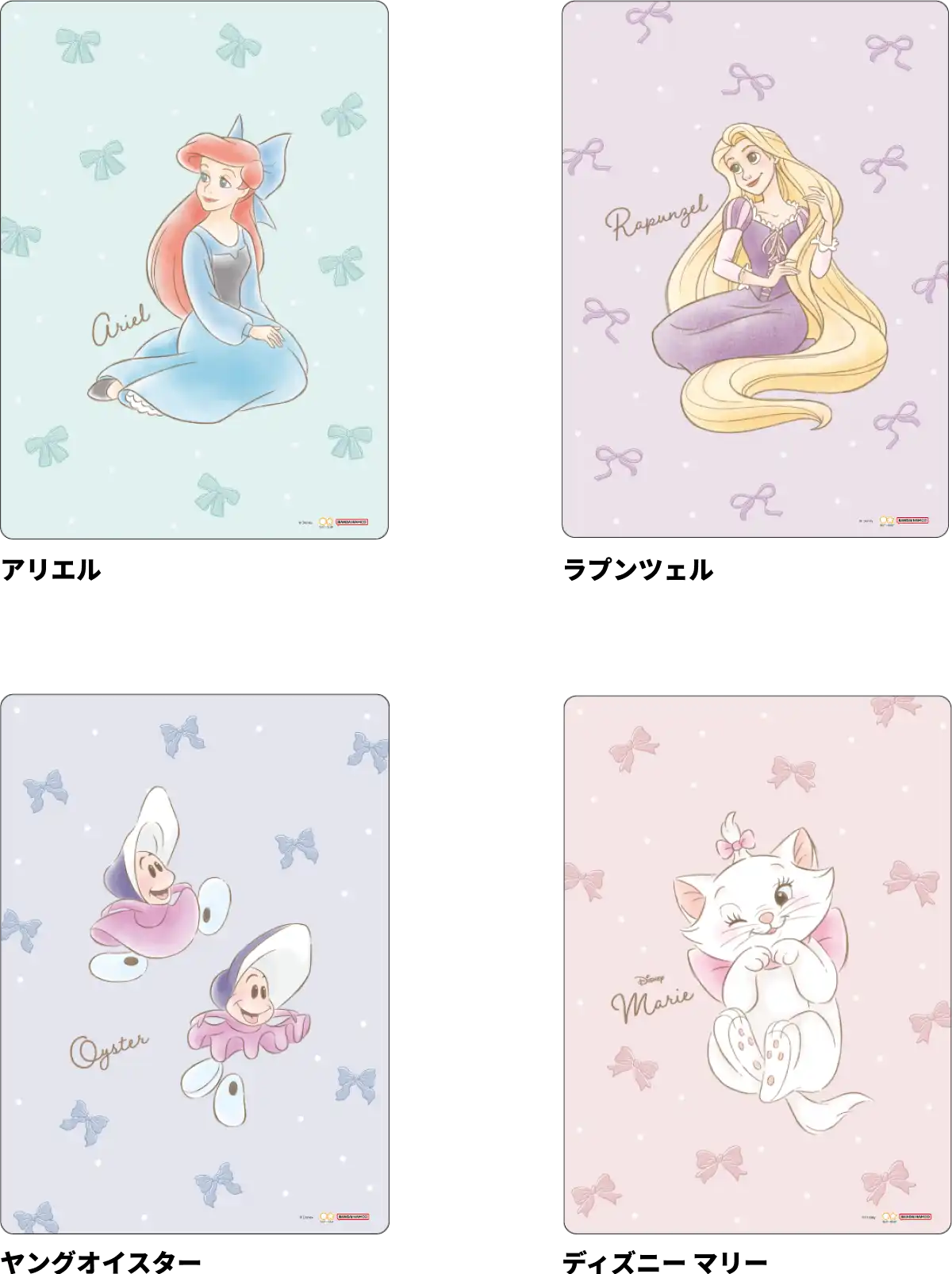 【本体サイズ】W60×H85×D11mm 【本体重量】45g【材質】PET・紙 【内容】本文:2柄 各50枚 計100枚 【パッケージ】なし 【生産国】日本【JANコード】アリエル:4901770043067 ラプンツェル:4901770043074 ヤングオイスター:4901770043081 ディズニー マリー:4901770043098