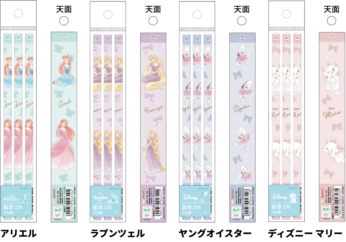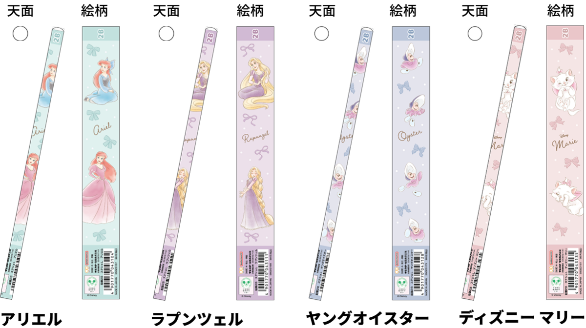 【本体サイズ】φ7.5×H178mm 【本体重量】5g【材質】木・黒鉛・粘土 【仕様】丸軸 2B 【パッケージ】なし 【生産国】日本【JANコード】アリエル:4901770043104 ラプンツェル:4901770043111 ヤングオイスター:4901770043128 ディズニー マリー:4901770043135
