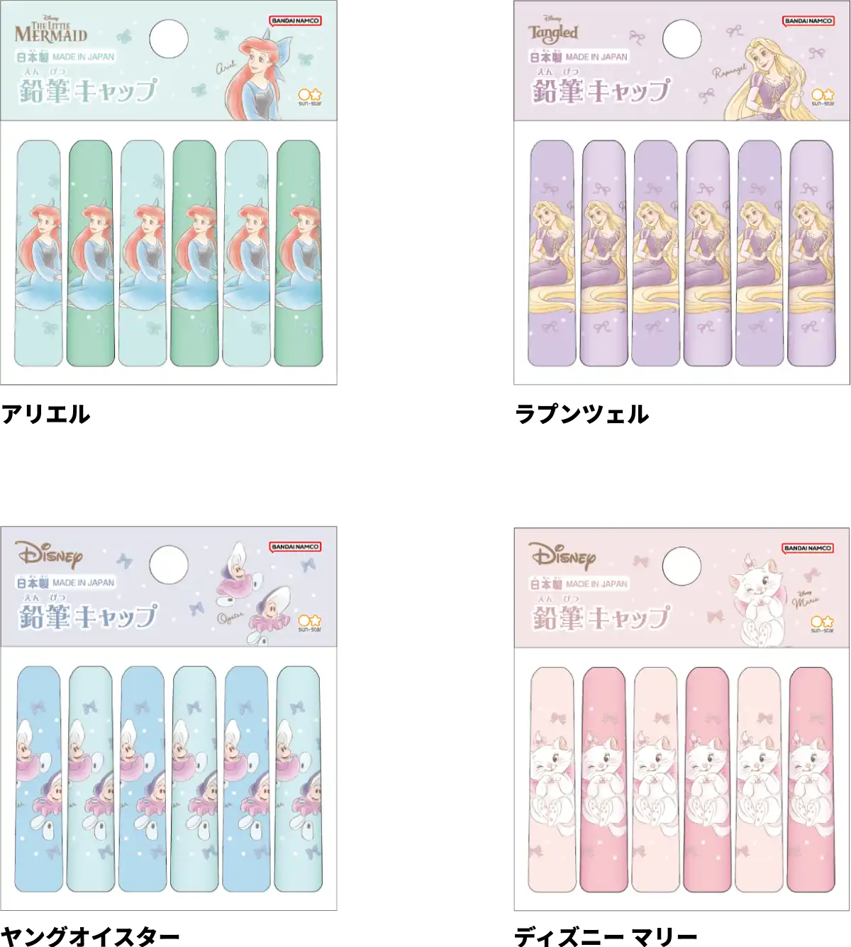 【本体サイズ】φ10×H45mm 【本体重量】1g【材質】PS 【内容】1柄6本 【パッケージ】台紙付PP袋(穴あき)【パッケージ入サイズ】約W70×H80×D10mm 【パッケージ入重量】約10g 【生産国】日本【JANコード】アリエル:4901770043302 ラプンツェル:4901770043319 ヤングオイスター:4901770043326 ディズニー マリー:4901770043333