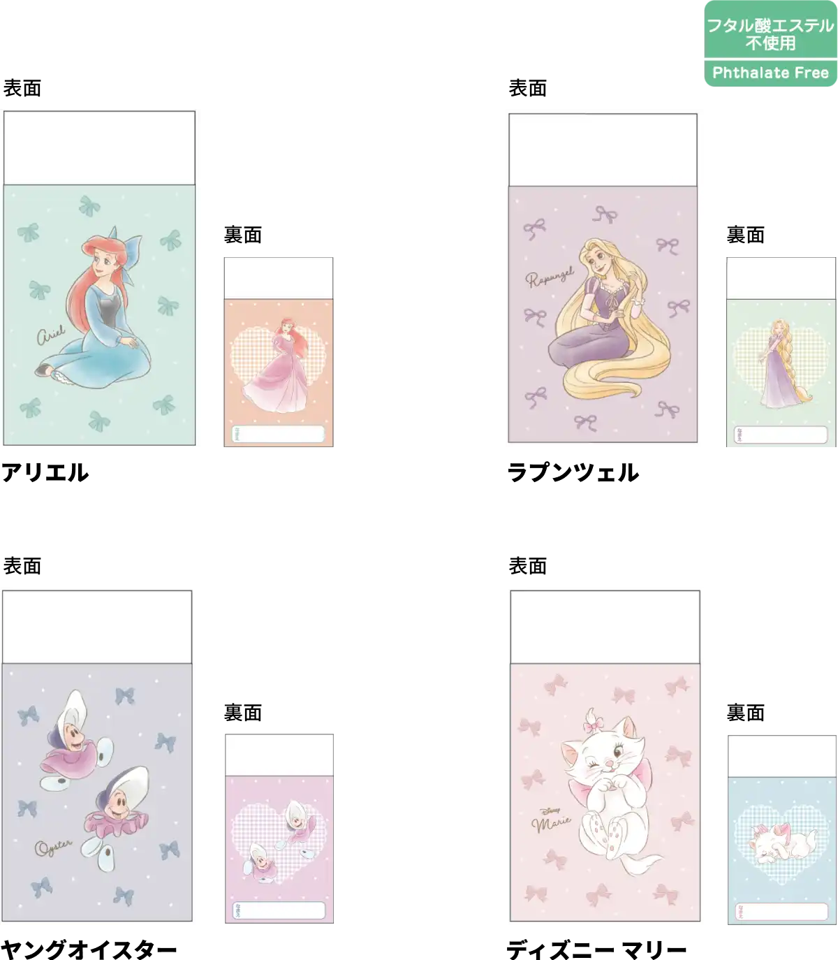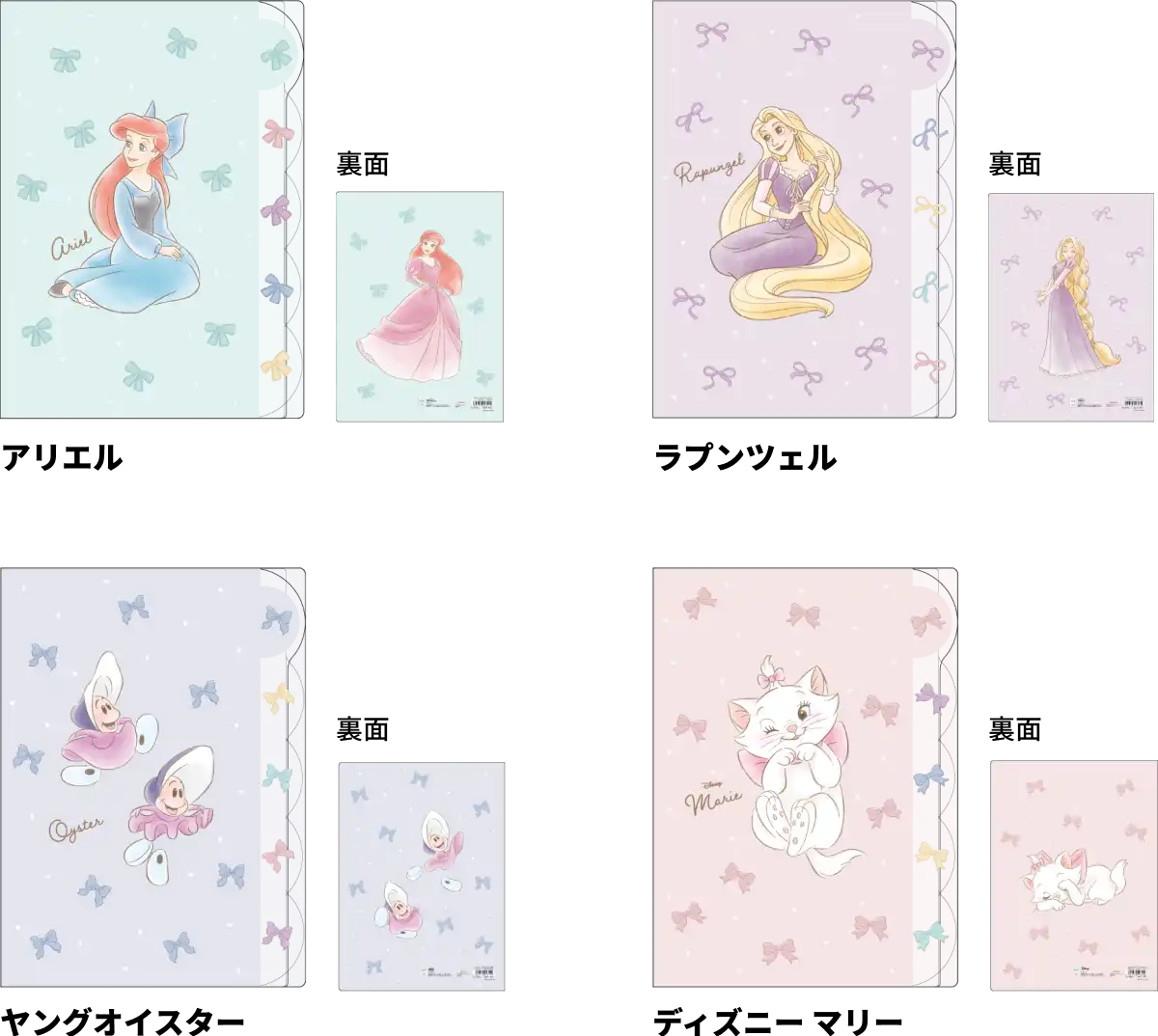 【本体サイズ】W180×H250×D0.6mm 【本体重量】27g 【材質】PP 【パッケージ】PP袋【パッケージ入サイズ】W185×H251×D0.8mm 【パッケージ入重量】28g 【生産国】日本【JANコード】アリエル:4901770043388 ラプンツェル:4901770043395 ヤングオイスター:4901770043401 ディズニー マリー:4901770043418