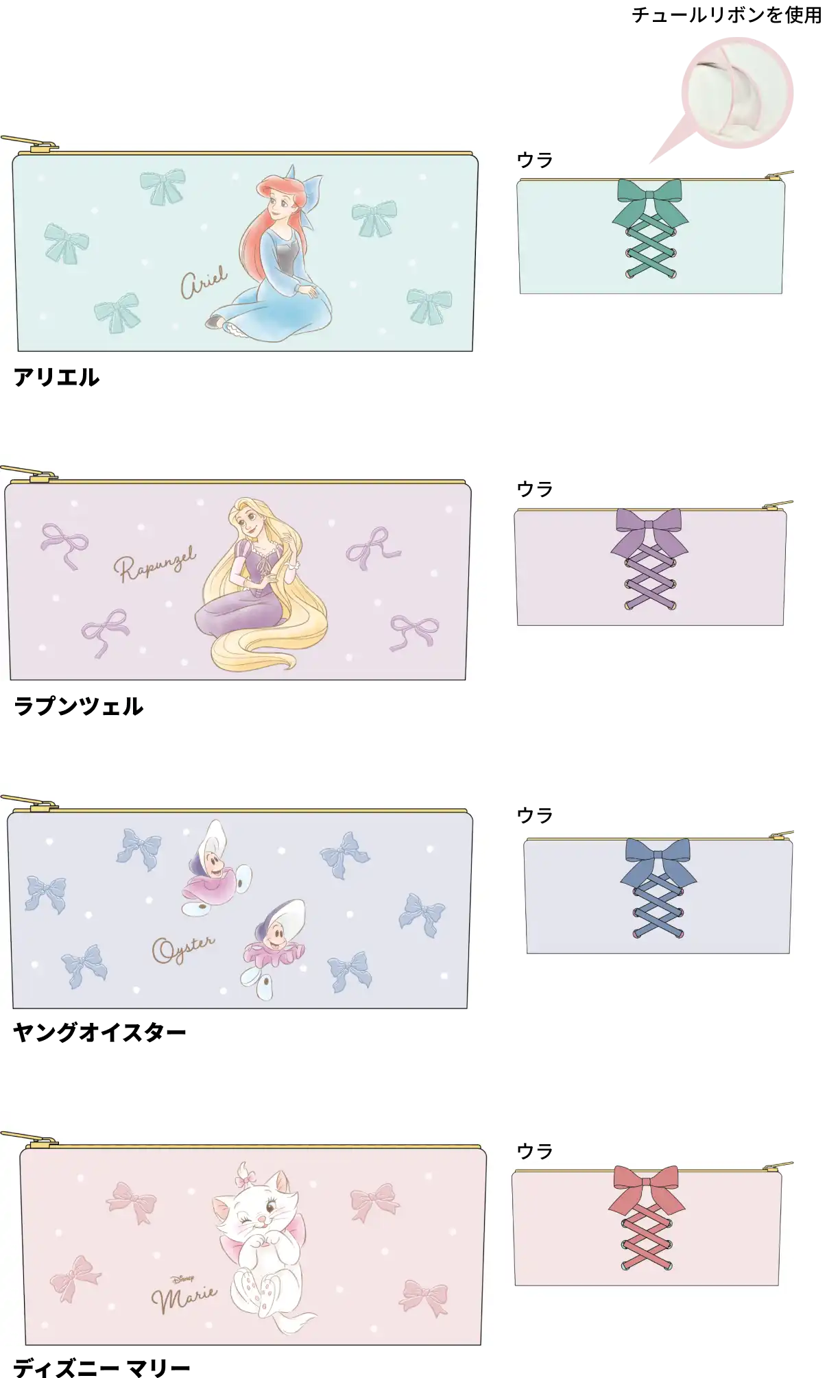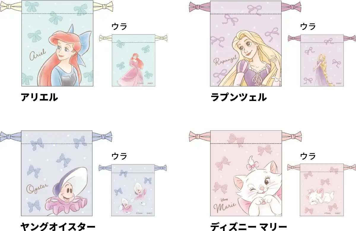 【本体サイズ】約W108×H130×D5mm(マチなし) 【本体重量】約20g【材質】ポリエステル【パッケージ】PP袋 【パッケージ入サイズ】約W128×H140×D8mm【パッケージ入重量】約23g 【生産国】中国【JANコード】アリエル:4901770043548 ラプンツェル:4901770043555 ヤングオイスター:4901770043562 ディズニー マリー:4901770043579