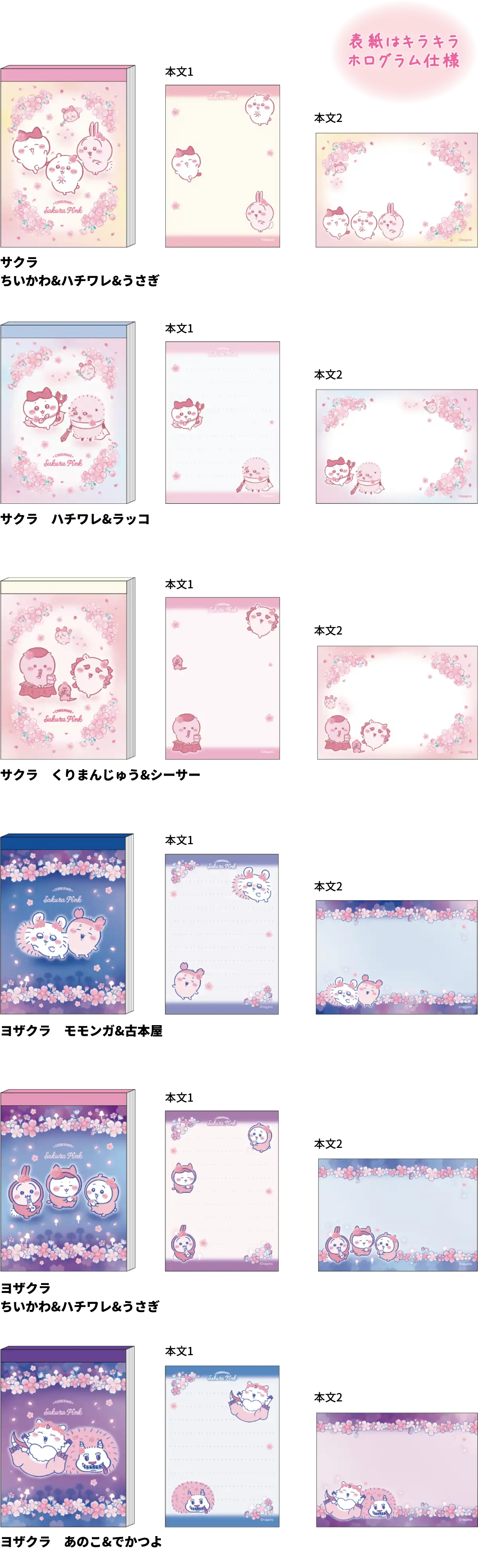 【本体サイズ】W60×H85×D11mm 【本体重量】45g 【材質】PET・紙【内容】本文: 2柄 各50枚 計100枚 【パッケージ】なし 【生産国】日本【JANコード】サクラ ちいかわ&ハチワレ&うさぎ:4901770050072 サクラ ハチワレ&ラッコ:4901770050089 サクラ くりまんじゅう&シーサー:4901770050096 ヨザクラ モモンガ&古本屋:4901770050102 ヨザクラ ちいかわ&ハチワレ&うさぎ:4901770050119 ヨザクラ あのこ&でかつよ:4901770050126