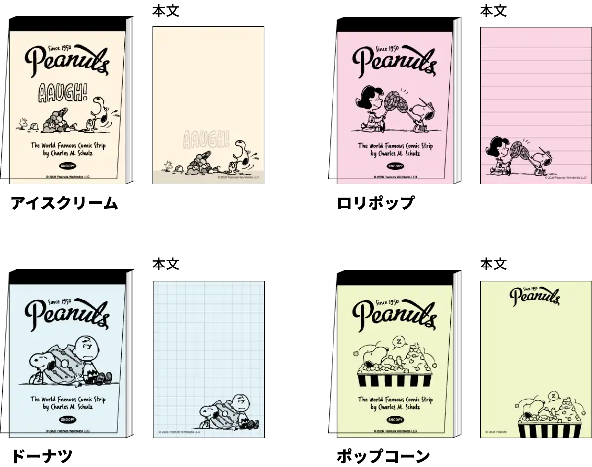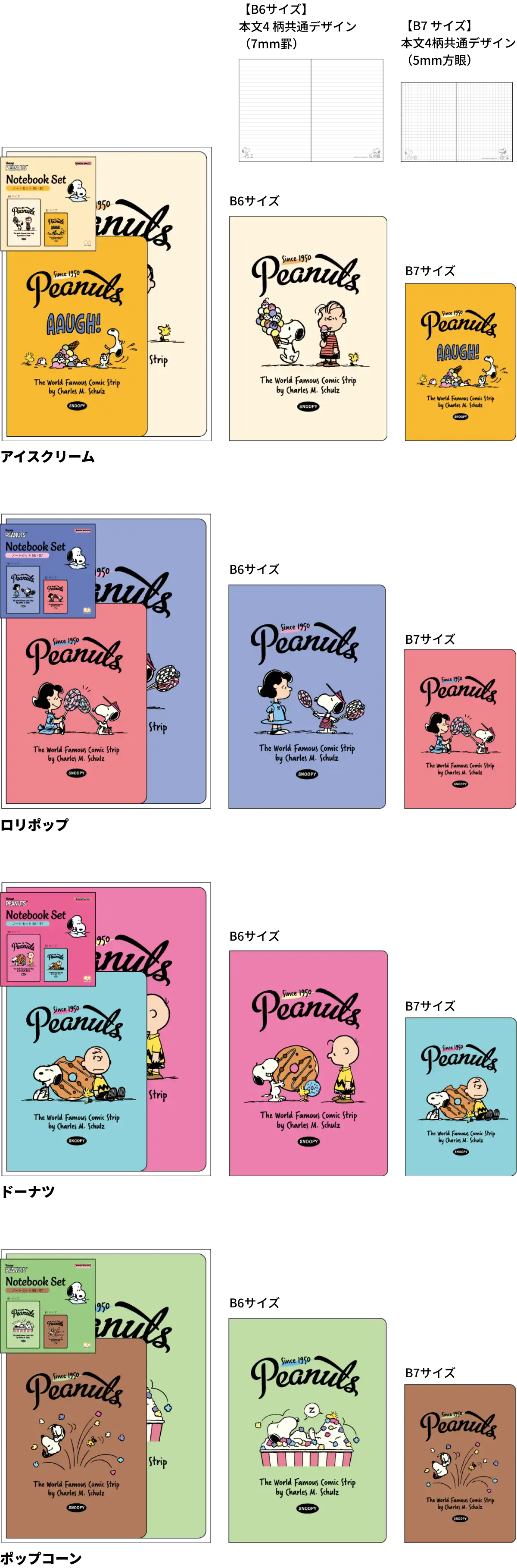 【本体サイズ】ノートB6:W128×H182×D2mm / ノートB7:W90×H128×D2mm【本体重量】ノートB6:約40g / ノートB7:約20g 【材質】紙 【内容】本文:16枚(32ページ)【パッケージ】PP袋 【パッケージ入サイズ】W133×H187×D4mm【パッケージ入重量】約60g【生産国】日本【JANコード】アイスクリーム:4901770047737 ロリポップ:4901770047744 ドーナツ:4901770047751 ポップコーン:4901770047768