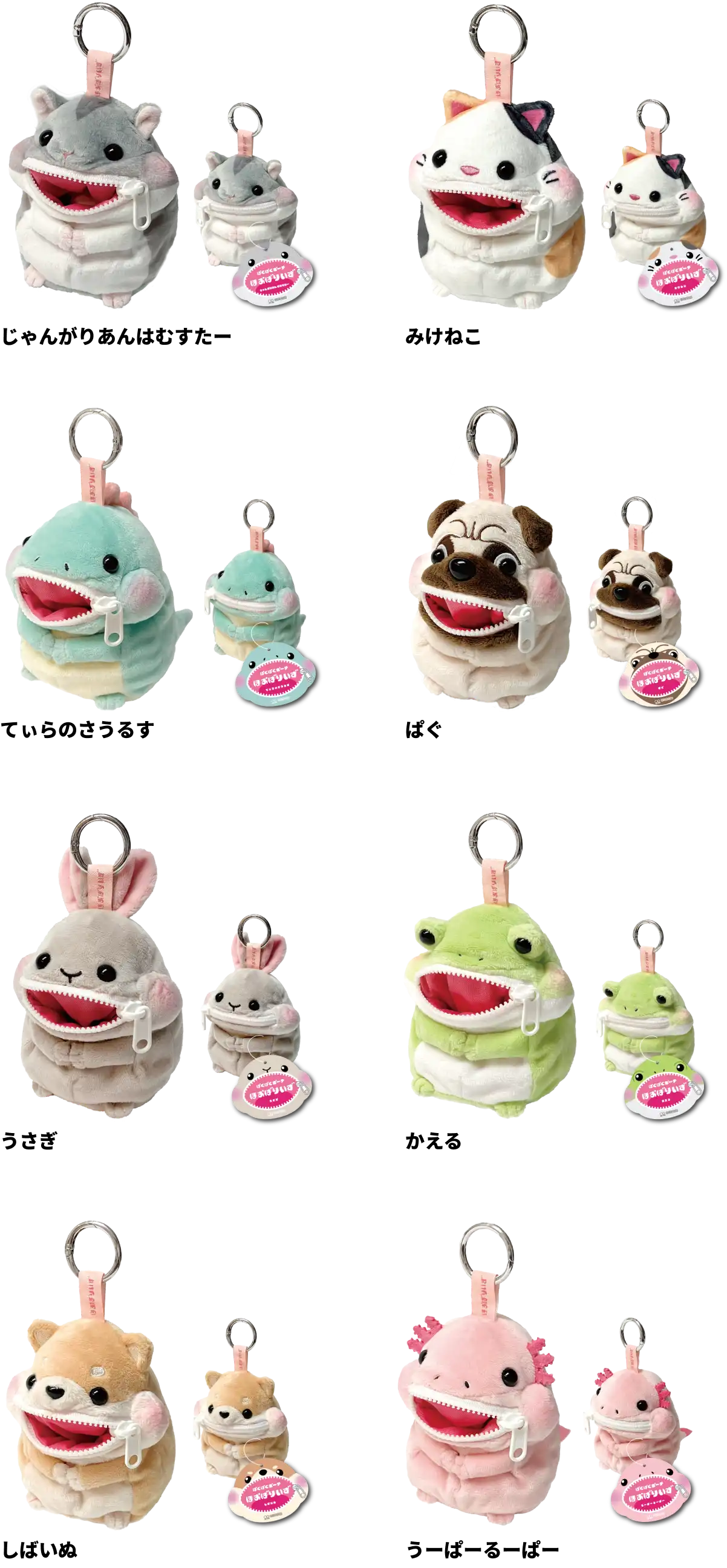 【本体サイズ】約W110×H160×D90mm 【本体重量】約40g 【材質】ポリエステル・亜鉛合金【パッケージ】なし(タグ・ループ付) 【生産国】中国【JANコード】じゃんがりあんはむすたー:4901770049946 みけねこ:4901770049953 てぃらのさうるす:4901770049960 ぱぐ:4901770049977 うさぎ:4901770049984 かえる:4901770049991 しばいぬ:4901770050003 うーぱーるーぱー:4901770050010