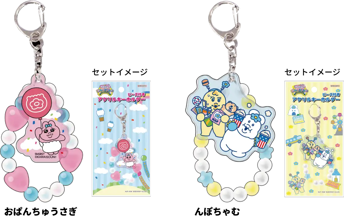【本体サイズ】約W50×H120×D12mm 【材質】アクリル・金属 【パッケージ】台紙付PP袋【パッケージ入サイズ】約W80×H160×D13mm 【パッケージ入重量】約17g 【生産国】日本【JANコード】おぱんちゅうさぎ:4901770053981 んぽちゃむ:4901770053998