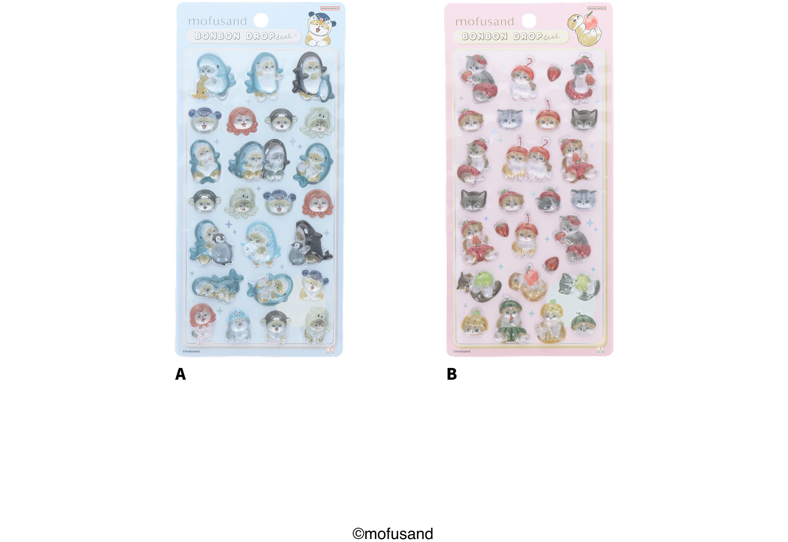 【2025年 1月発売】mofusand ¥550-(消費税込) 【本体サイズ】W95×H170×D5mm【本体重量】20g【材質】PVC【パッケージ】ブリスター(台紙付)【パッケージ入サイズ】W95×H200×D7mm【パッケージ重量】33g【生産国】中国【JANコード】A:4901770777191 B:4901770777207