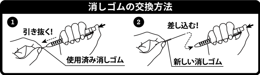 (2) ノックした状態のままで、新しい消しゴムをプラスチックの芯の方からしっかり奥まで差し込んでください。