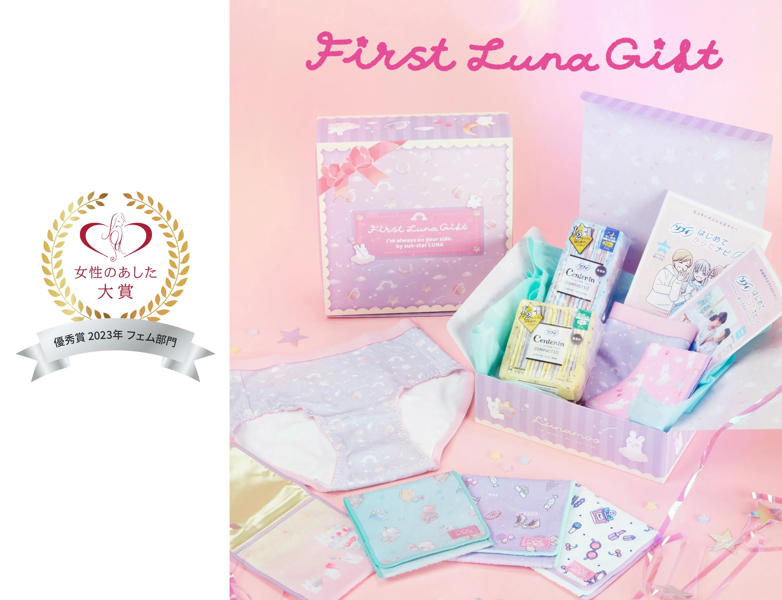 お知らせ 2023.12.19 「First Luna Gift」が『女性のあした大賞 2023』フェム部門・優秀賞を受賞! 「ブルーな日にこそカワイイものを!」をコンセプトに商品化した、はじめての生理に寄り添った初経準備セット「First Luna Gift」が『第8回 女性のあした大賞2023』フェム部門・優秀賞を受賞いたしました。 詳細はこちら
